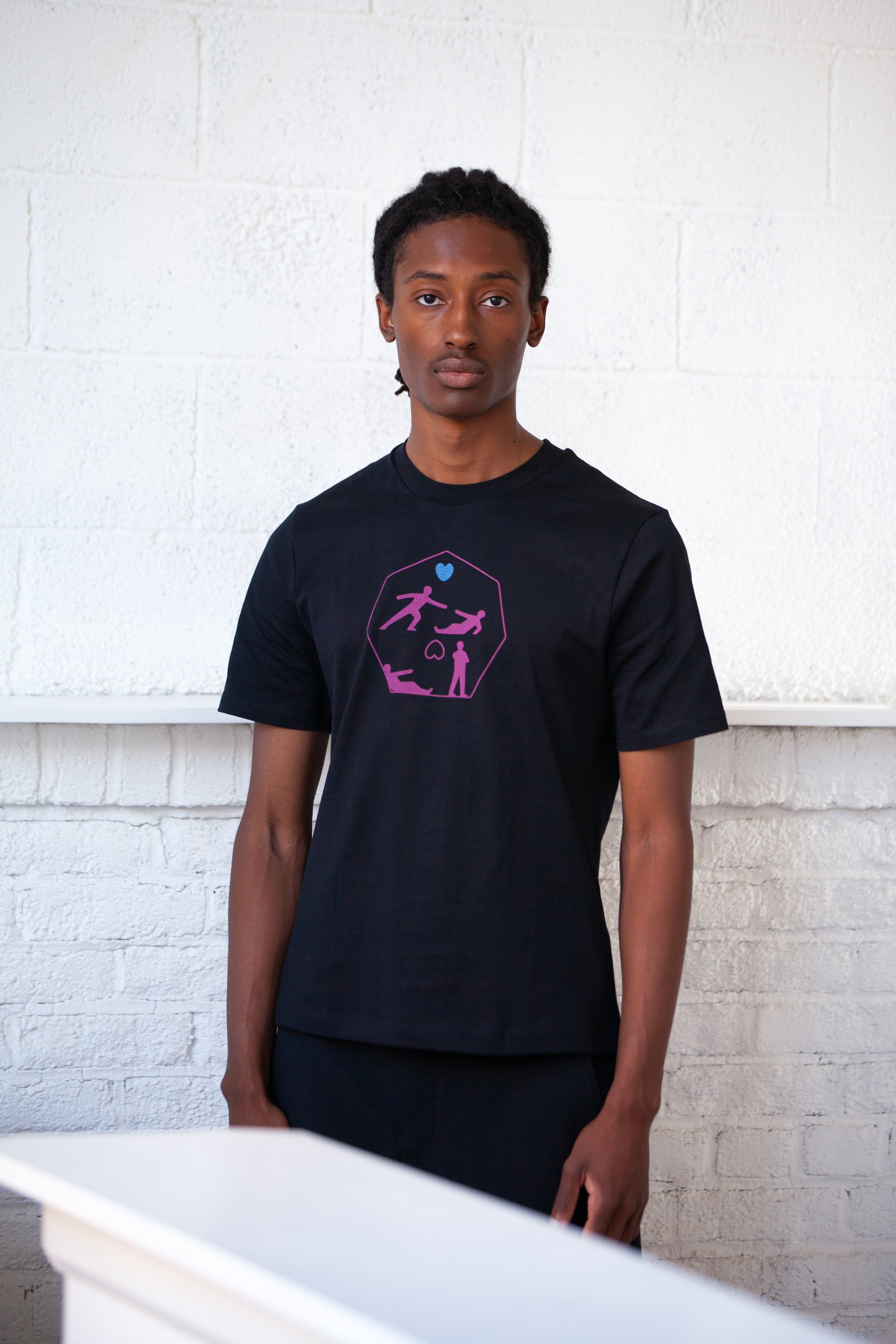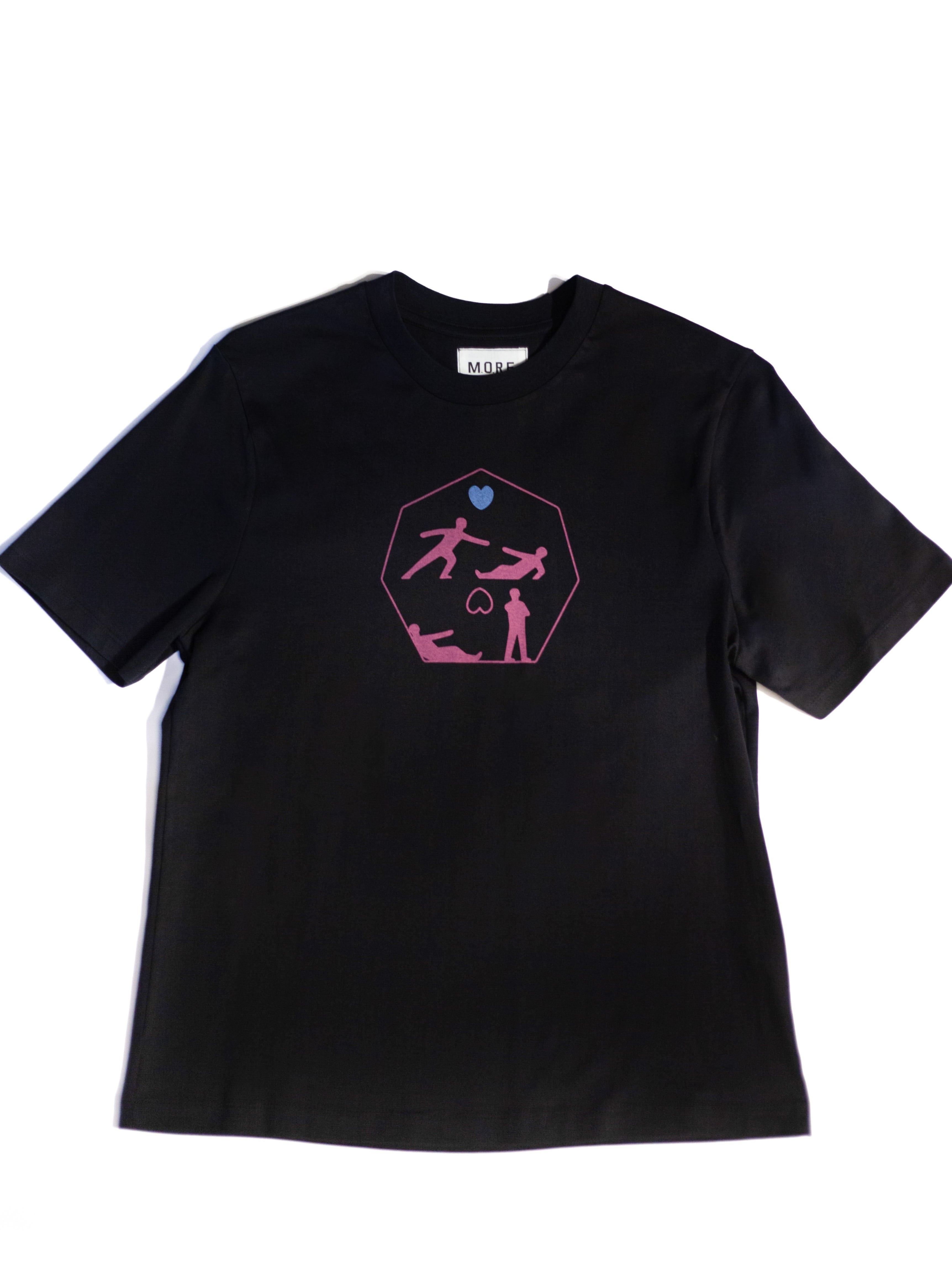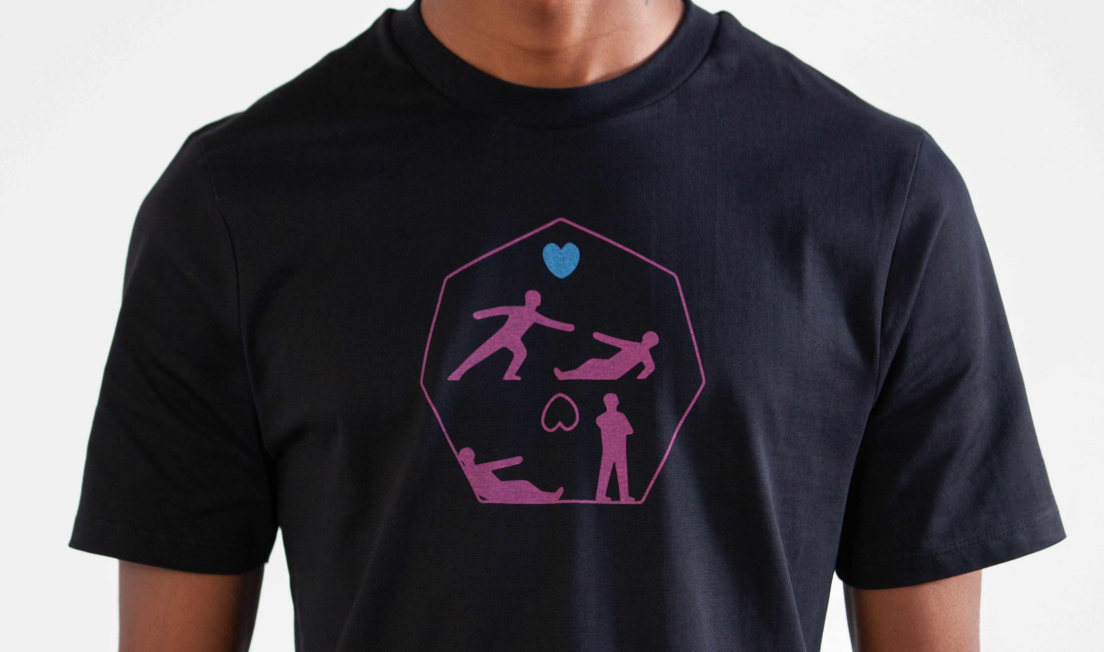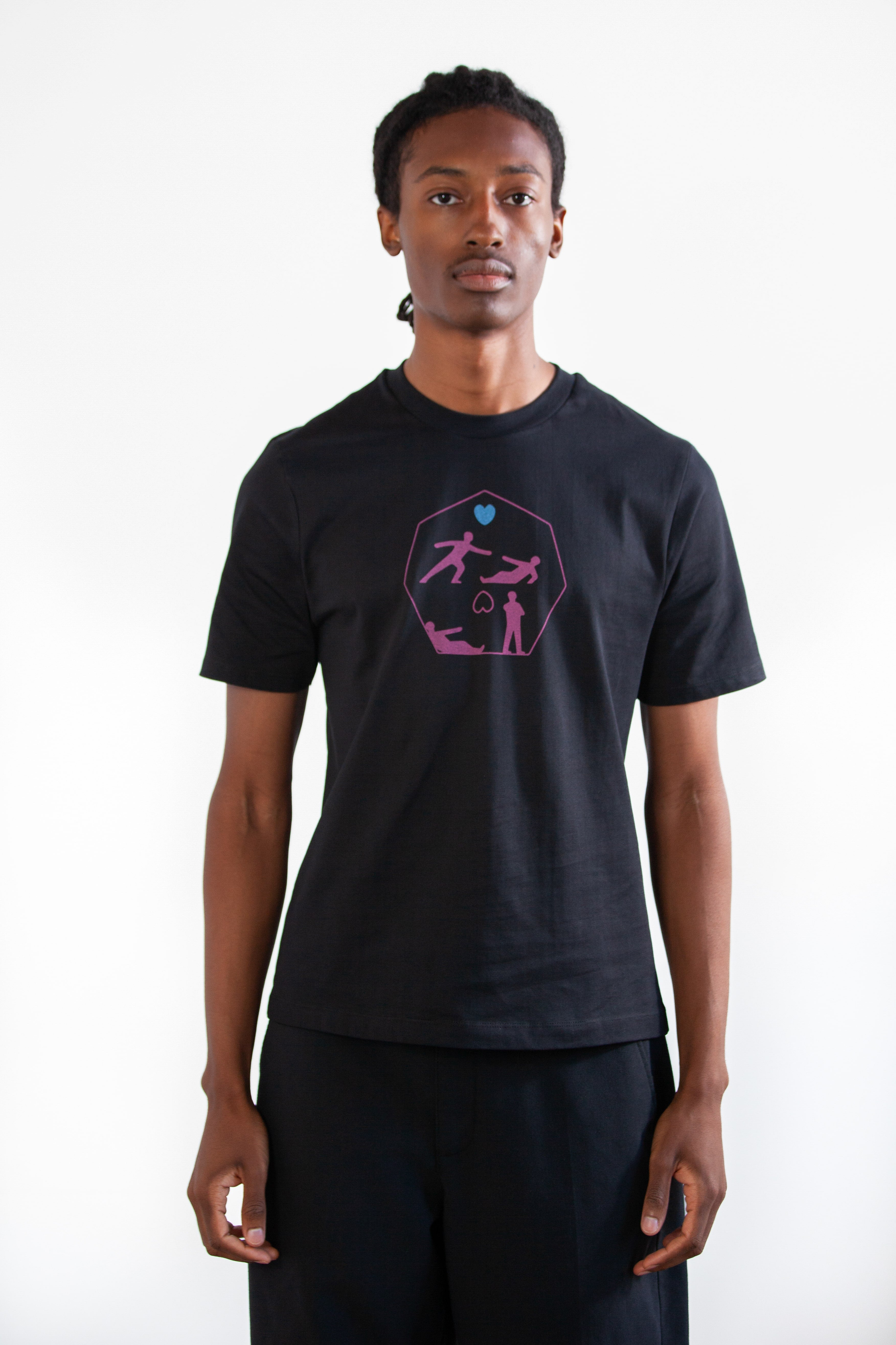 Design consists of a non-filled off red heptagon and figures with a hollow inverted heart on the bottom half of the design and a filled blue upright heart on the top half of the design.