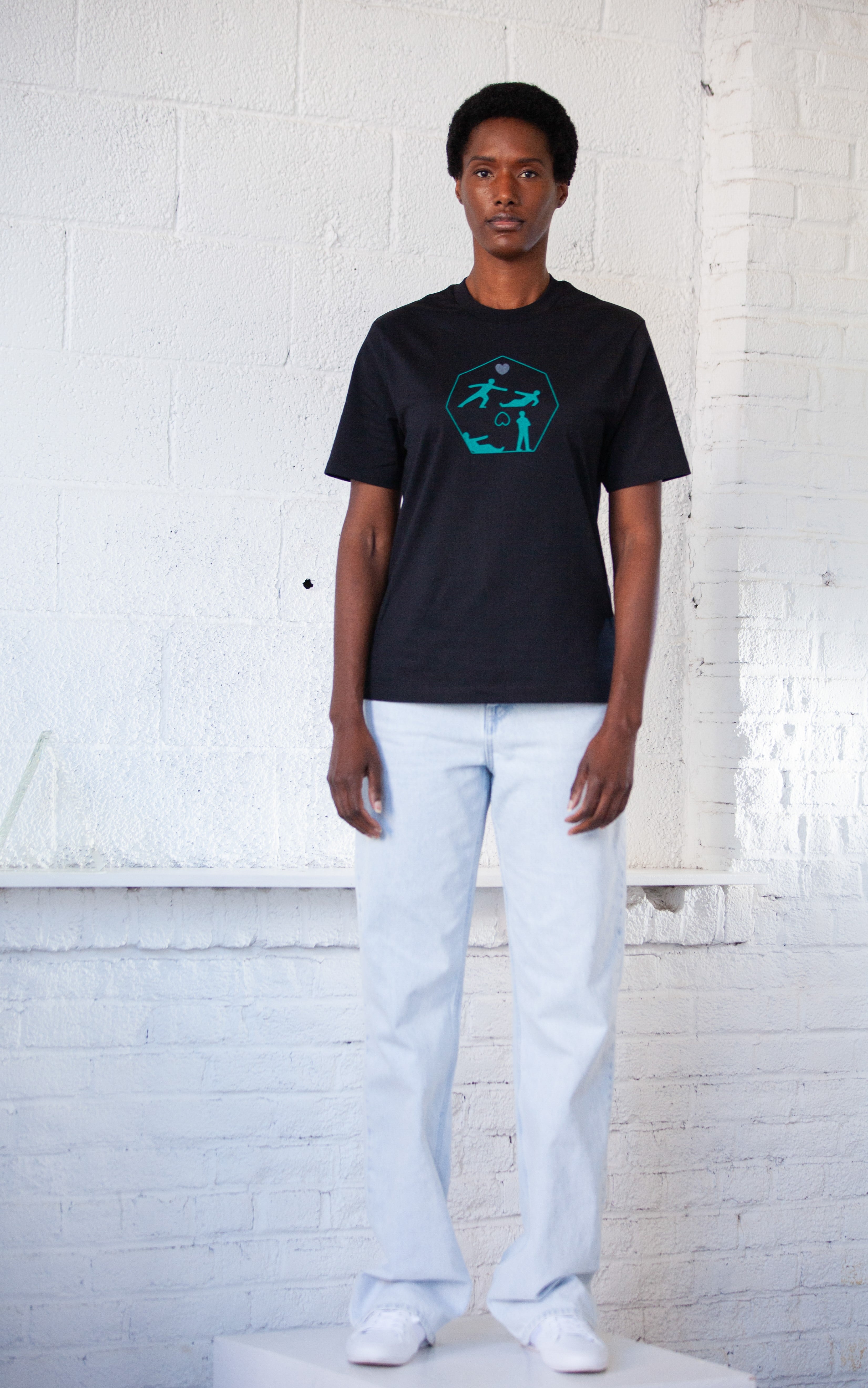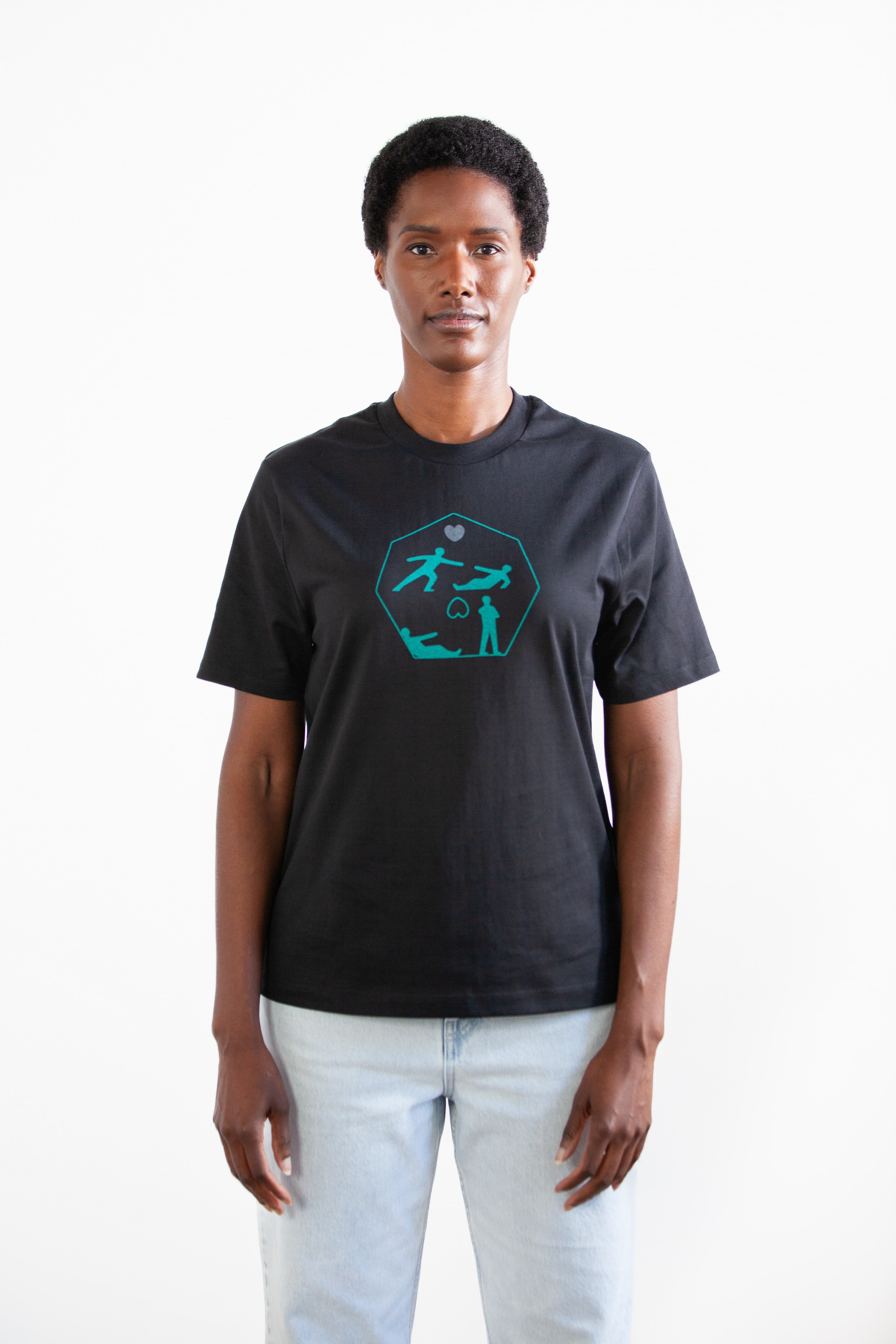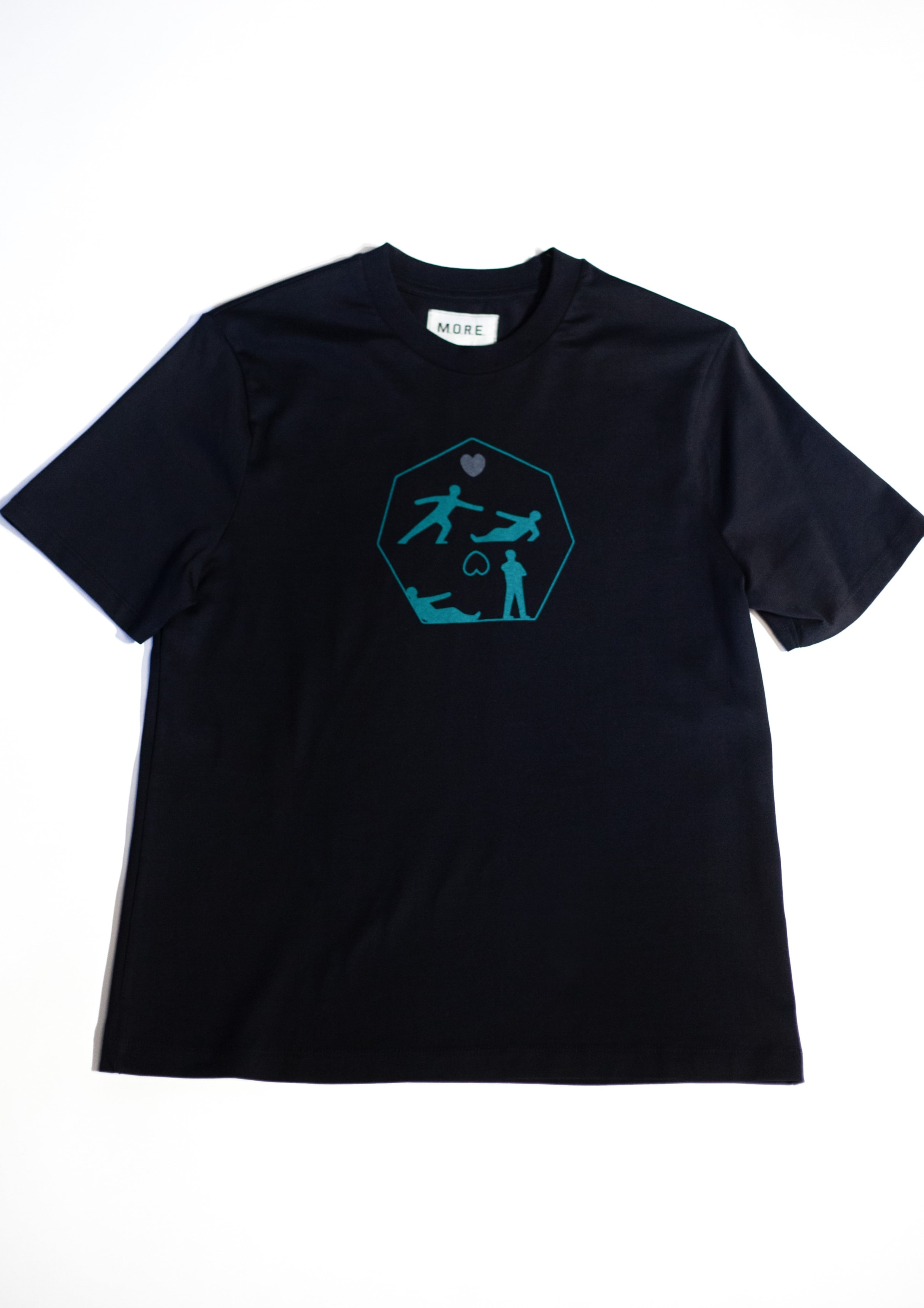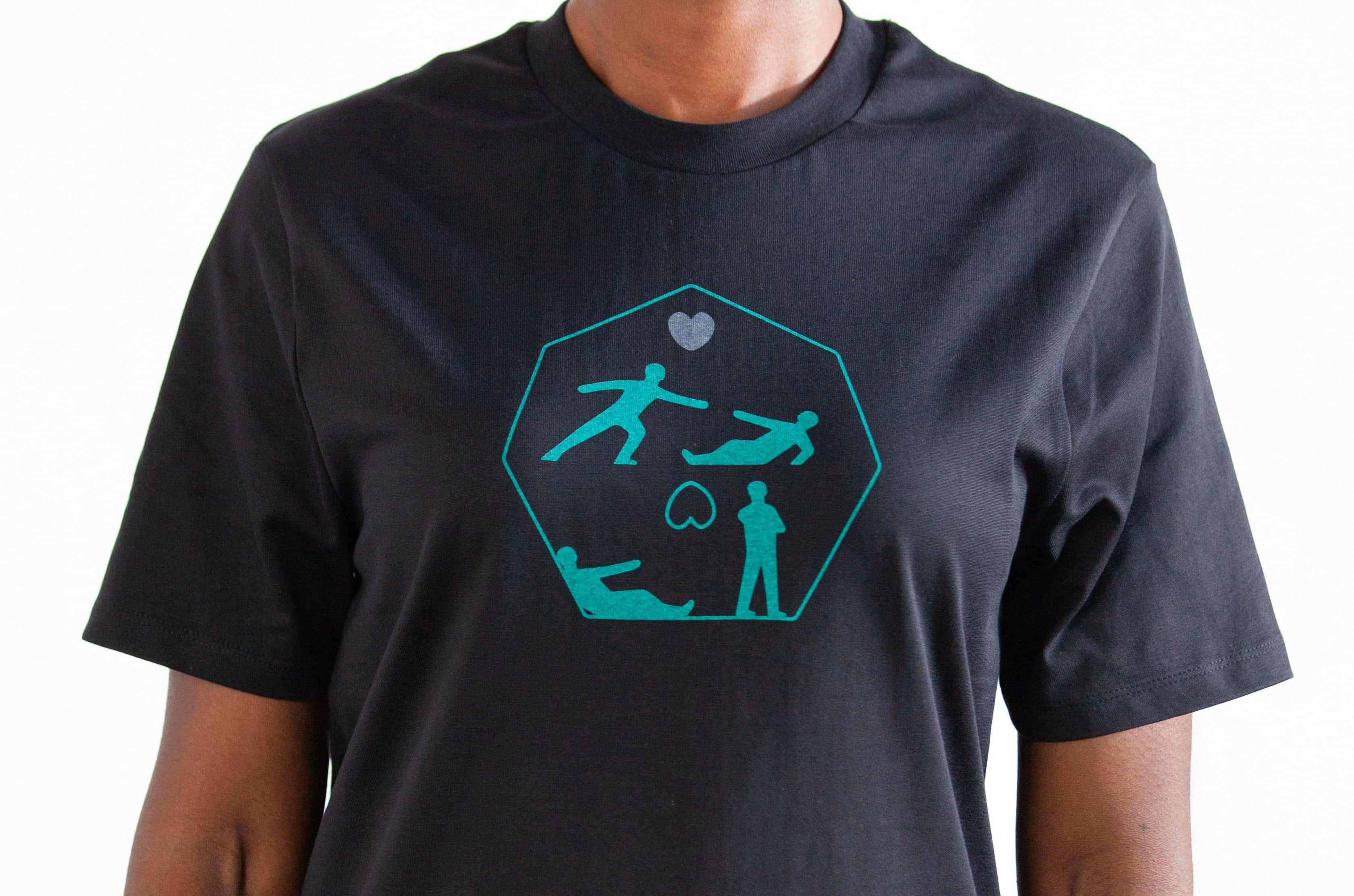 Design consists of a non-filled green heptagon and figures with a hollow inverted heart on the bottom half of the design and a faded white upright heart on the top half of the design.