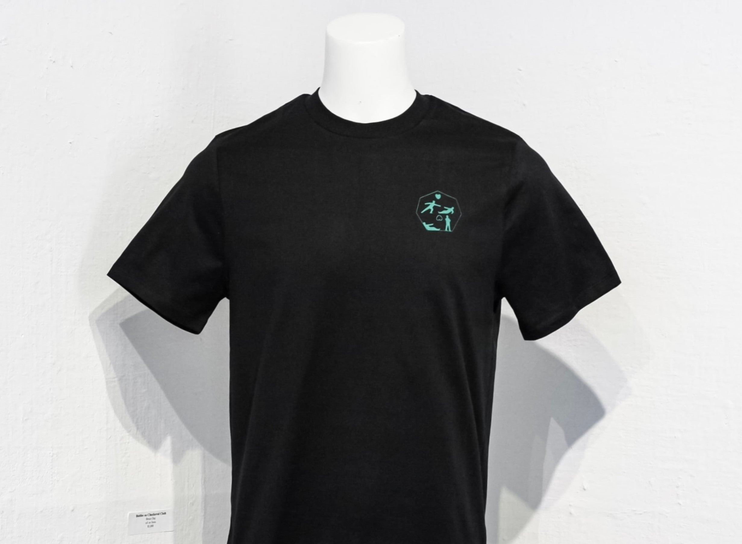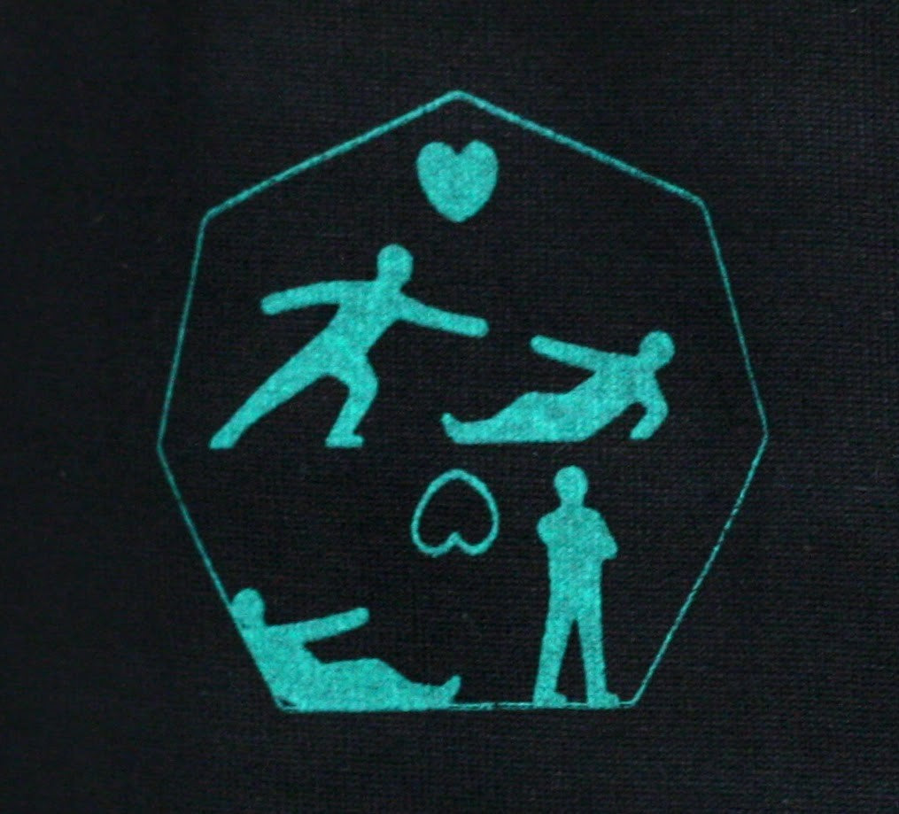 Design consists of a non-filled green heptagon and figures with a hollow inverted heart on the bottom half of the design and a filled upright heart on the top half of the design.