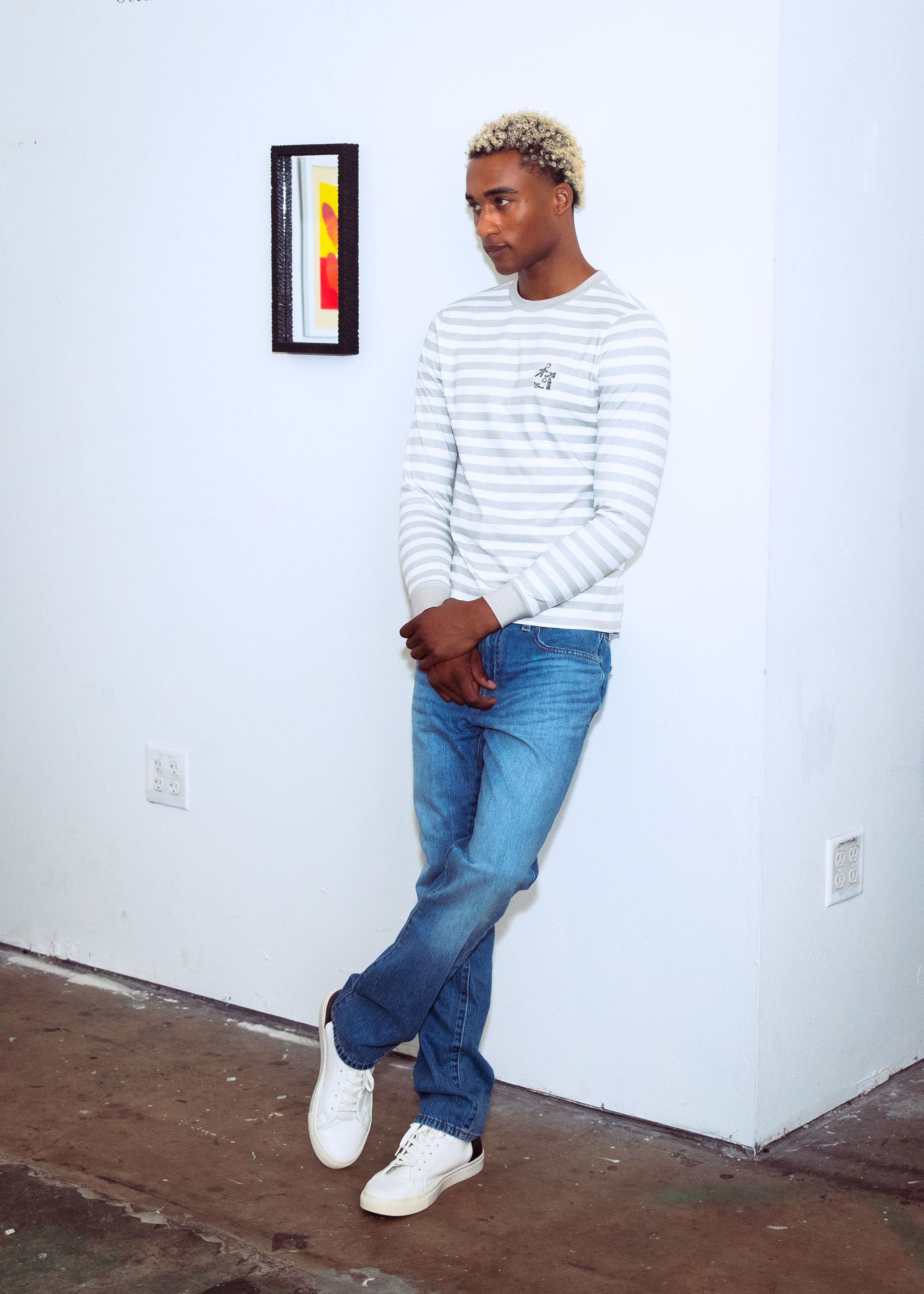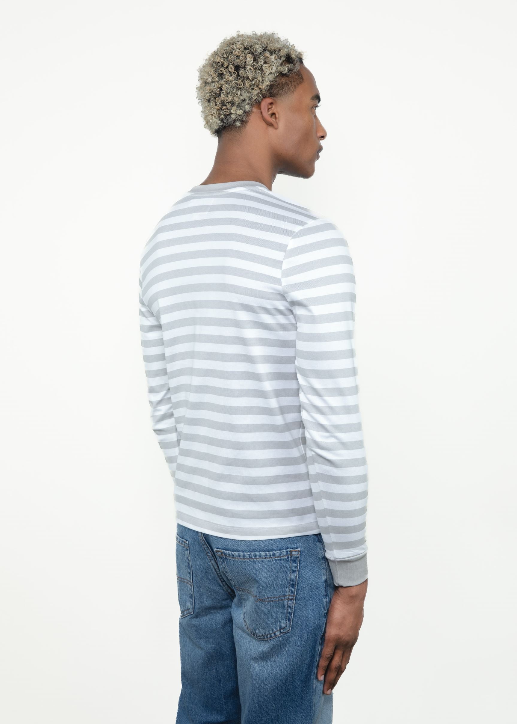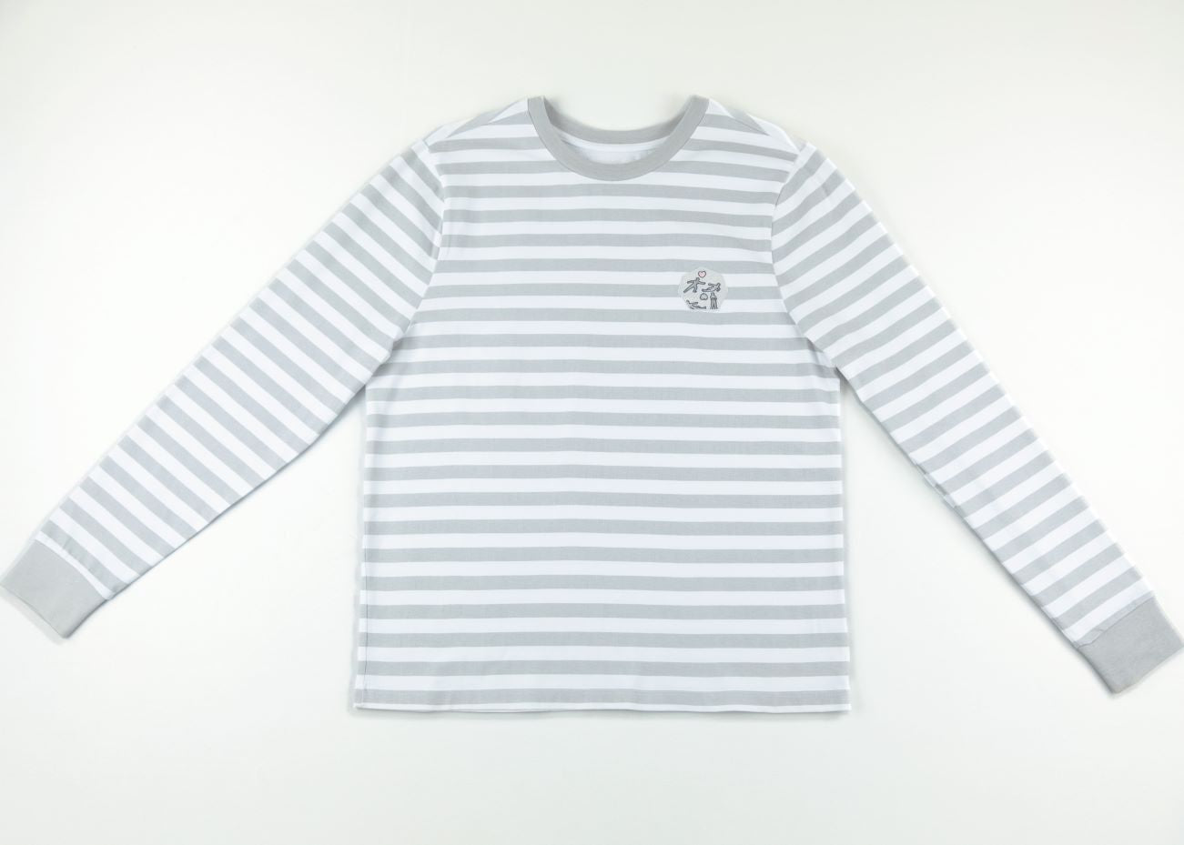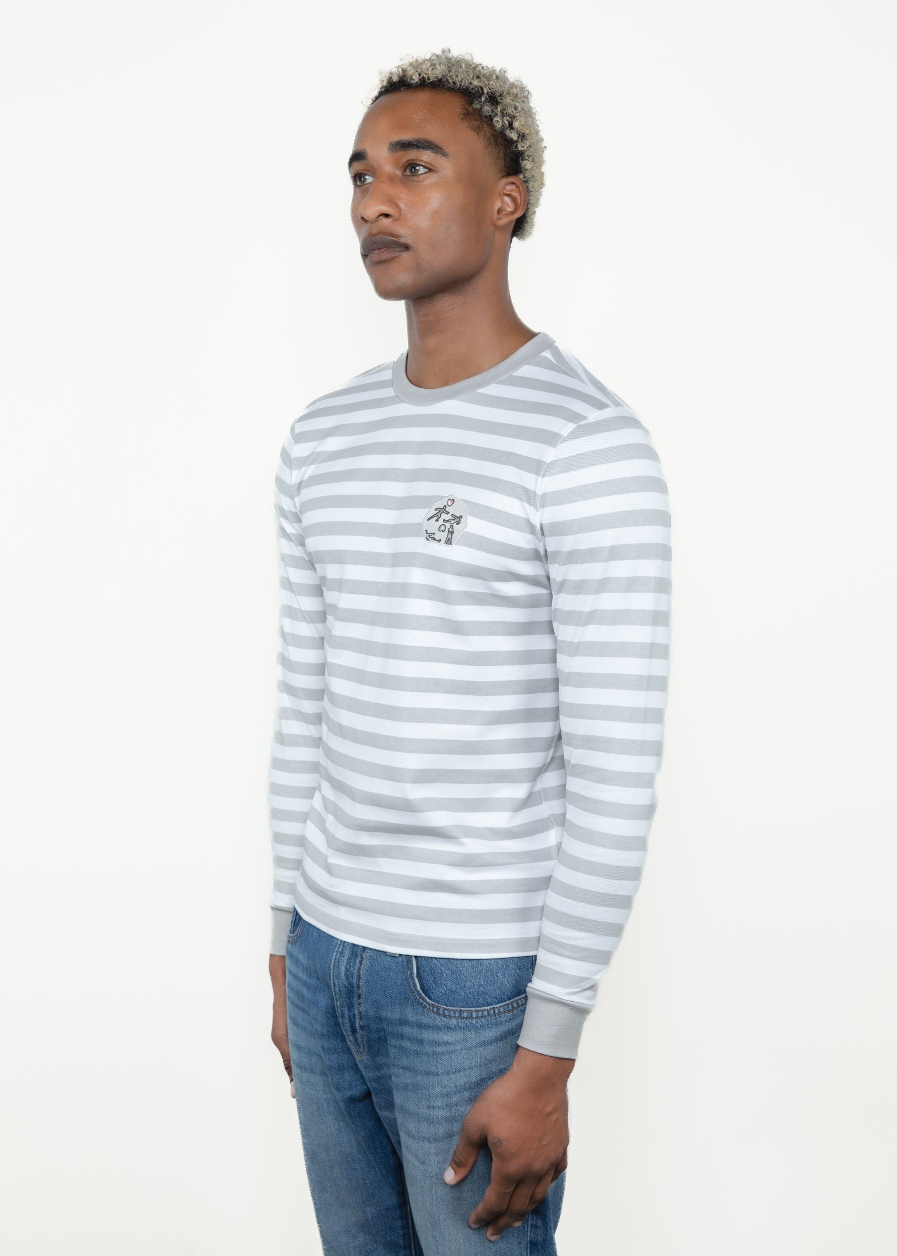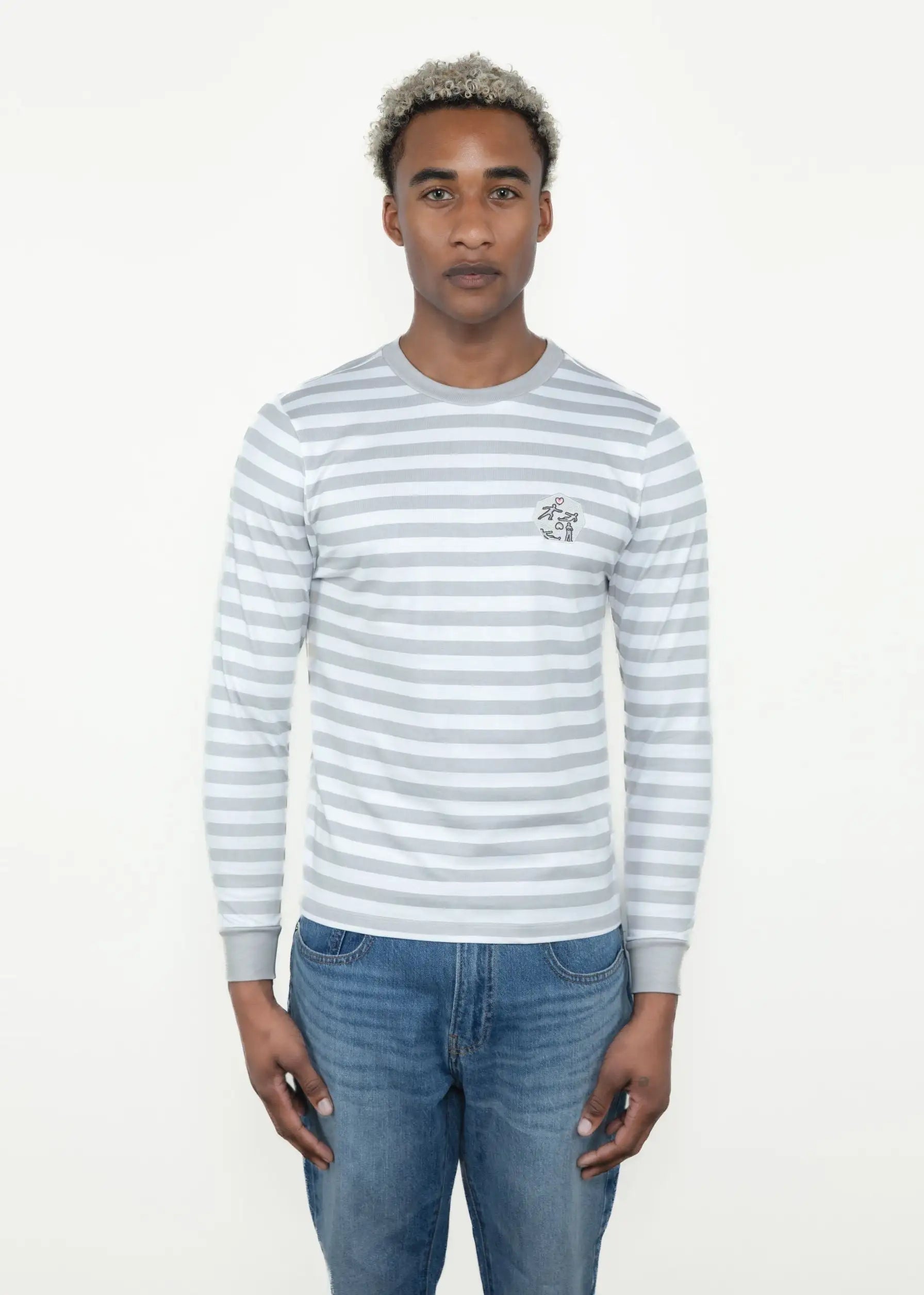 Inaugural edition of the M.O.R.E. long sleeve stripe t-shirt in light grey and white. On the front of the shirt, the Art Icon embroidered (left chest) in two tones of grey with a pink heart and dark grey outlines around the figures and heart.